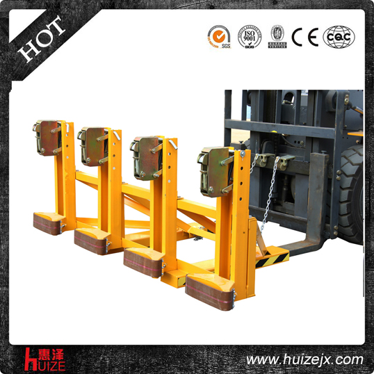 重型四油桶夾單鷹嘴DG2000A純機械機構設計可與叉車方便地配合,僅依靠叉車的動作,不需要其它的動力,可自動一次搬運4個鋼制油桶, ?配置可拆換式柔性耐磨保護墊,有效保護油桶并緩沖叉車行駛過程中的震動, 能在集裝箱等這樣狹小的環境內裝卸桶裝物質,可極大地提高空間利用率, 與貨叉連接配有自鎖裝置確保油桶夾在坡度上和顛簸路面使用時不會滑落.